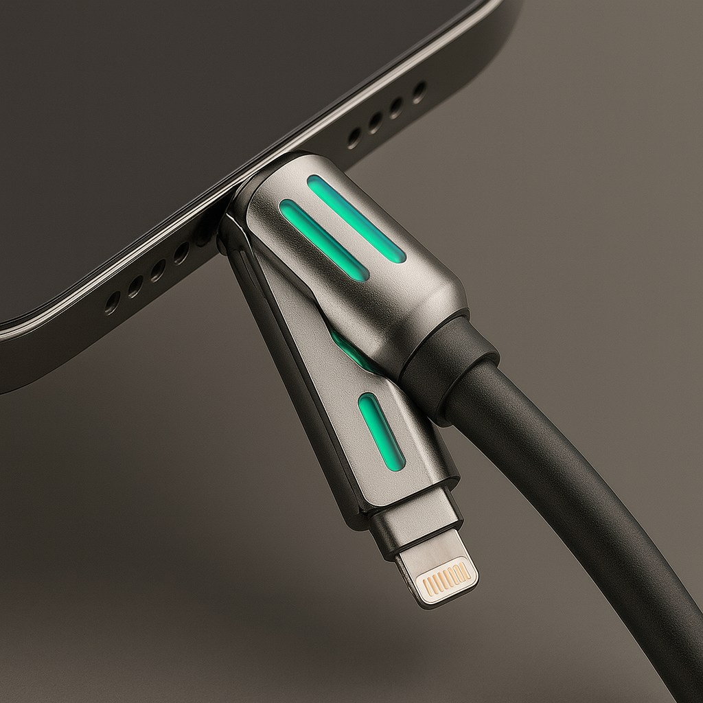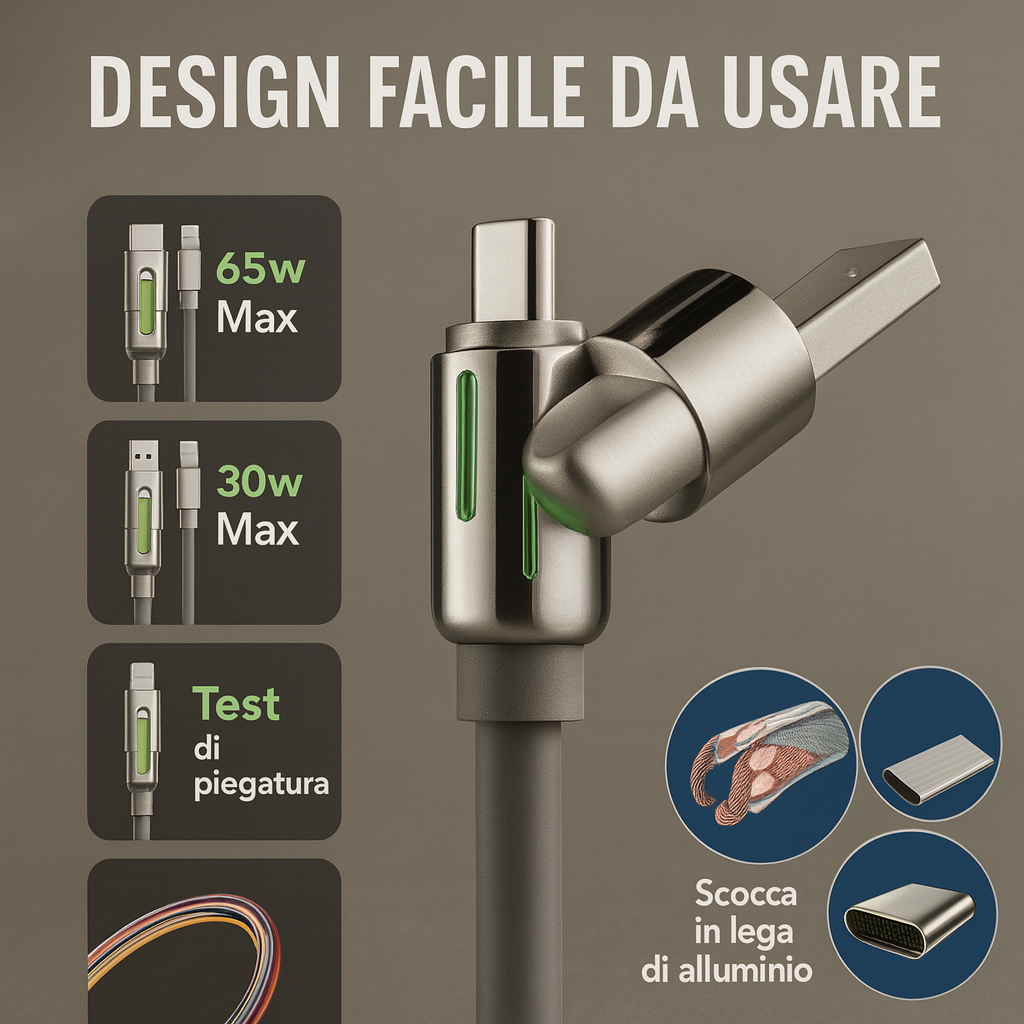 Cavo in silicone ultra-resistente, morbido al tatto ma capace di sopportare migliaia di piegature senza usurarsi.